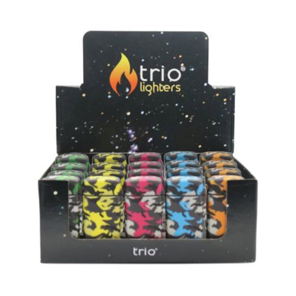 The Camouflage Jet Lighter is a unique jet lighter design from the Trio, featuring a distinct Jippo-style. Standing at approximately 6cm tall, this product combines a metal casing with the renowned Zippo lighter design.