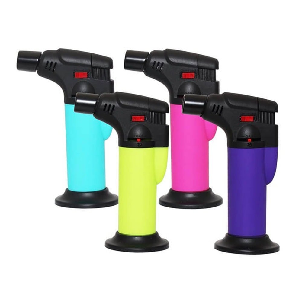 The Trio Fluro Blow Torch Jet Lighter is a distinctive jet lighter designed specifically for smoking needs with bongs, dab rigs, or specialized water pipes. The product features a shotgun-style design with the ignition button located on the back, making it extremely convenient to use with just your thumb.