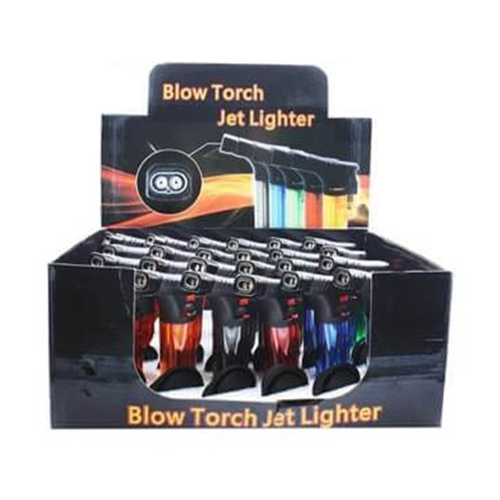 The Twin Flame Blow Jet Lighter is a distinctive jet lighter designed specifically for smoking needs with bongs, dab rigs, or specialized water pipes. The product features a shotgun-style design with the ignition button located on the back, making it extremely convenient to use with just your thumb.